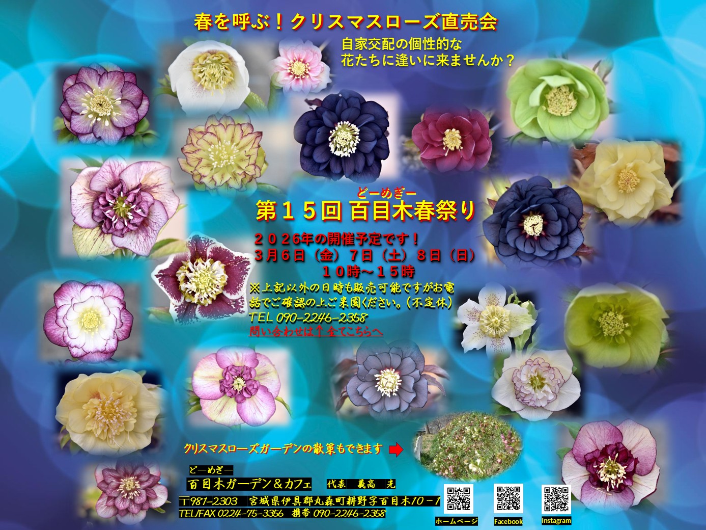 今年のクリスマスローズ直売会「第15回・百目木春祭り」を、3月6日(金),7日(土),8日(日)の10時~15時に開催します。皆様のご来場を、お待ちしております!
